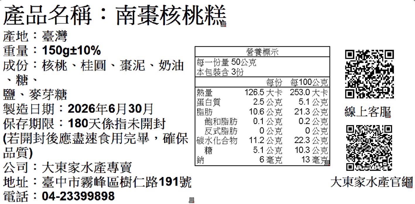 【成分】麥芽糖、核桃、棗泥漿(黑棗、紅棗)、棗泥餡(園云豆、黑棗、大豆沙拉油、麥芽糖、紅棗)、海藻糖、馬鈴薯粉、大豆沙拉油、鹽。